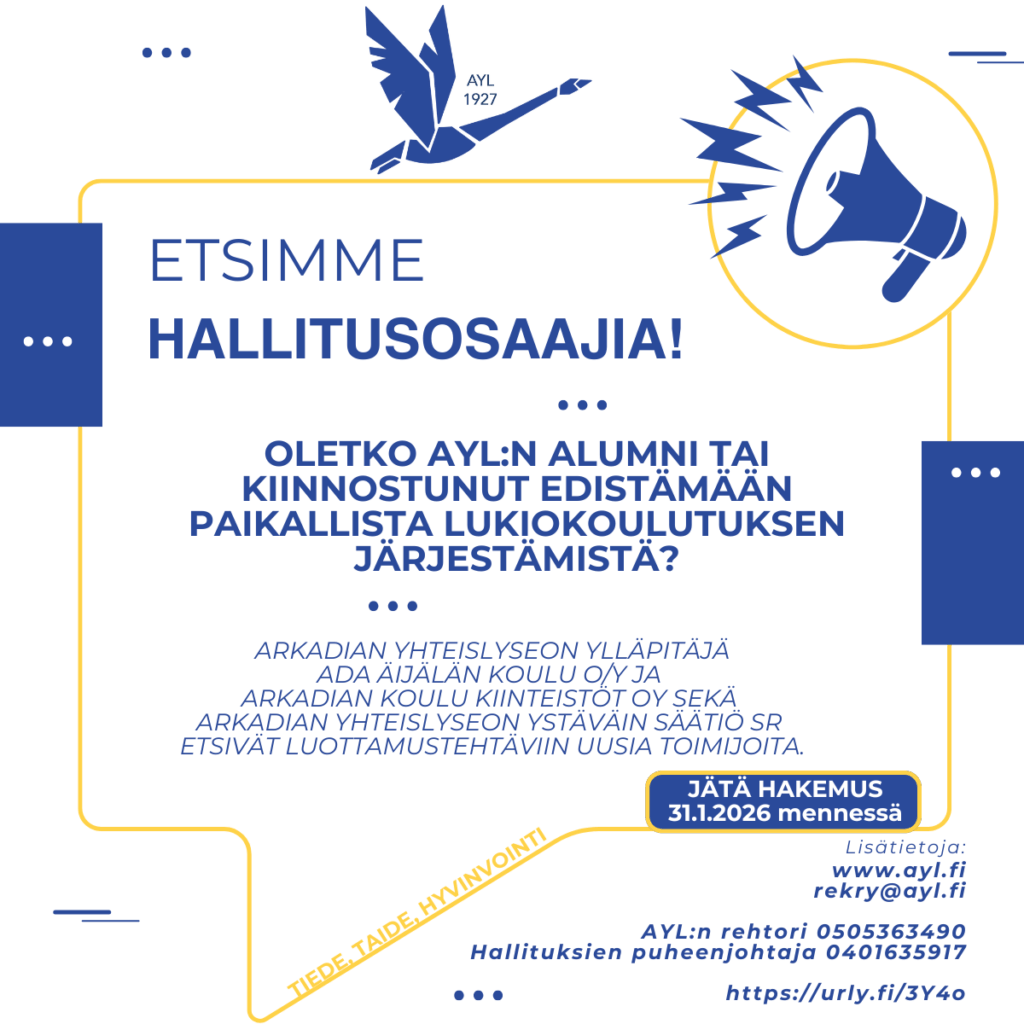 Arkadian yhteislyseon taustayhteisöt etsivät hallitusosaajia